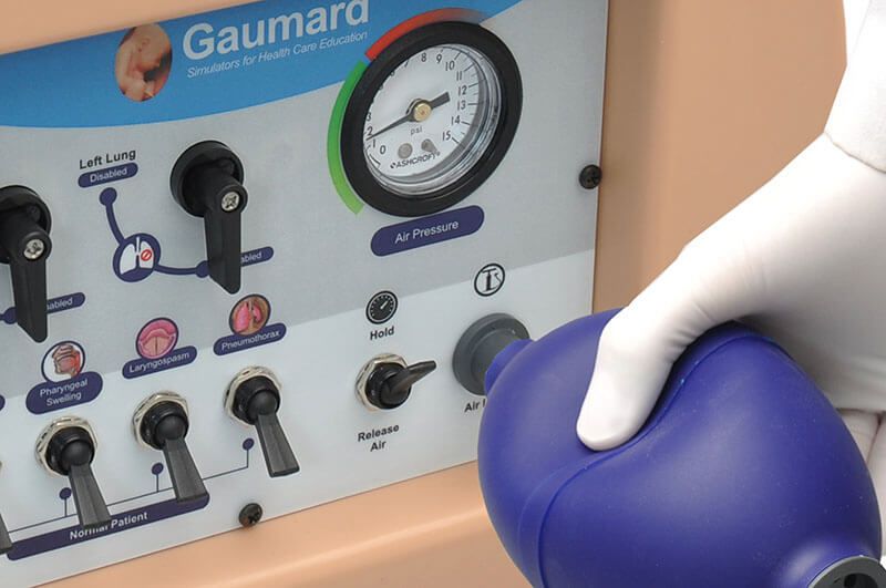 - realistyczne drogi oddechowe z możliwością manualnego uruchomienia obrzęku języka, laryngospazmu oraz obrzęku gardła