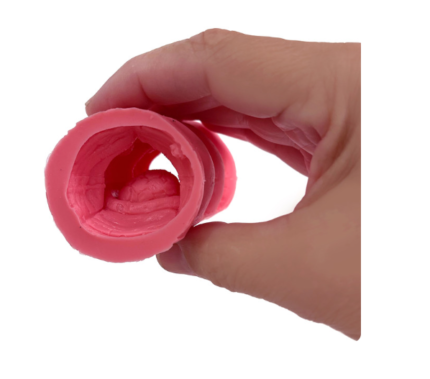 Elastyczny model fragmentu jelita grubego o długości ok. 9 cm. Wewnątrz modelu widocznych jest 5 polipów oraz zmiana nowotworowa. Model można przełożyć na lewą stronę w celu dokładniejszego obejrzenia zmian patologicznych. Doskonałe narzędzie do dyskusji na temat badań przesiewowych i raka jelita grubego.