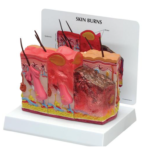Model skóry w przekroju, przedstawiony w powiększeniu. Jedna strona modelu obrazuję budowę zdrowej tkanki skórnej, druga przedstawia oparzenie pierwszego, drugiego oraz trzeciego stopnia.