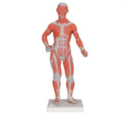 Pomniejszony model prezentujący układ mięśniowy człowieka, odwzorowany z zachowaniem realistycznych kolorów. Demontowalna klatka piersiowa umożliwia obserwację wewnętrznych narządów. Po prawej stronie modelu widoczny jest odwzorowany żeński gruczoł sutkowy. Posiada 125 ręcznie ponumerowanych i zidentyfikowanych struktur ludzkiej anatomii. Model zamontowany na podstawie.