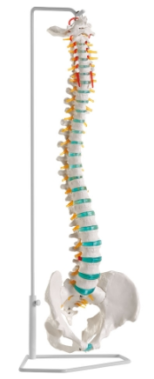 W pełni ruchomy, naturalnej wielkości model kręgosłupa dedykowany do nauki anatomii. Składa się z kości potylicznej, kręgów szyjnych, piersiowych i lędźwiowych, kości krzyżowej, kości ogonowej oraz kompletnej miednicy. Budowa modelu obejmuje również tętnice kręgowe, nerwy rdzeniowe oraz dyskopatię na poziomie L3-L4. Model zamontowany na stojaku do powieszenia.