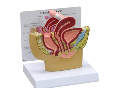 Model przedstawiający w pomniejszeniu budowę miednicy kobiety, w przekroju środkowym. Budowa modelu obejmuje kluczowe struktury anatomiczne, w tym jajnik i jajowód. Stanowi narzędzie edukacyjne do nauki anatomii. Idealnie sprawdzi się zarówno w sali lekcyjnej, jak i w gabinecie lekarskim.