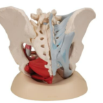4-częściowy model żeńskiej miednicy z odwzorowanymi kluczowymi strukturami anatomicznymi (więzadła, mięśnie, organy). Wykonany z zachowaniem  naturalnych rozmiarów. Prawa połowa modelu prezentuje struktury kostne z więzadłami.  Budowa lewej połowy modelu obejmuje mięśnie dna miednicy, w tym mięsień dźwigacz odbytu, mięsień kulszowo-jamisty, mięsień poprzeczny głęboki, mięsień poprzeczny powierzchowny krocza, mięsień zwieracz zewnętrzny odbytu, mięsień zwieracz cewki moczowej zewnętrzny.