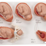 Narzędzie edukacyjne w postaci modeli zamontowanych na podstawie. Przedstawione w skali 1:2 modele prezentują 5 faz porodu:
