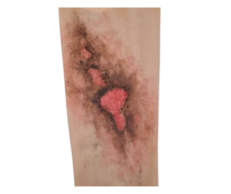 Nakładana na pozoranta wyjątkowo cienka i realistyczna nakładka z raną przedstawiającą przedramię lub łydkę po oparzeniu. Model szczególnie przydatny do celów edukacyjnych, takich jak szkolenia z zakresu pierwszej pomocy, medycyny ratunkowej lub pielęgnacji ran oparzeniowych.