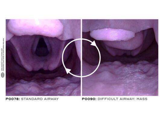 Wymienne drogi oddechowe do trenażera do intubacji V2 posiadające guz/nowotwór pomiędzy nagłośnią a strunami głosowymi.