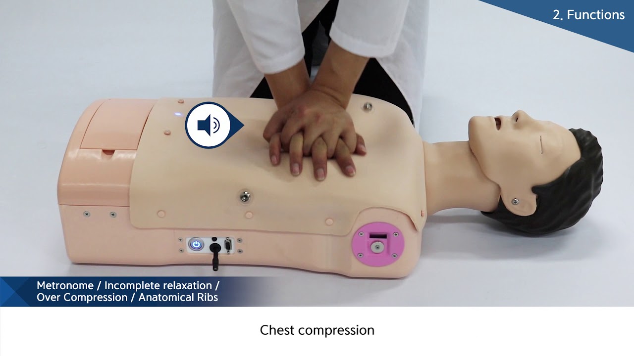 • metronom pomaga ćwiczącym w prawidłowym uciskaniu klatki piersiowej, można go włączyć w kilku trybach: wyłączony, 100 uderzeń/min, 110 uderzeń/min, 120 uderzeń/min