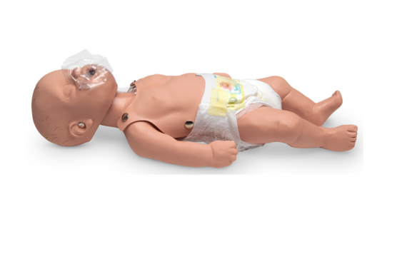 Ekonomiczny fantom noworodka Sani Baby CPR charakteryzuje się łatwą instalacją jednorazowego systemu osłony dróg oddechowych/twarzy. Widoczne anatomiczne punkty orientacyjne obejmują mostek i klatkę żebrową oraz wcięcie podmostkowe.