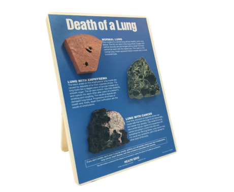 Tablica edukacyjna obrazująca wpływ palenia tytoniu na płuca. Budowa obejmuje modele tkanki płuc wraz z opisem ich stanu – tkanka prawidłowa, tkanka zniszczona przez rozedmę, tkanka ze zmianami nowotworowymi.