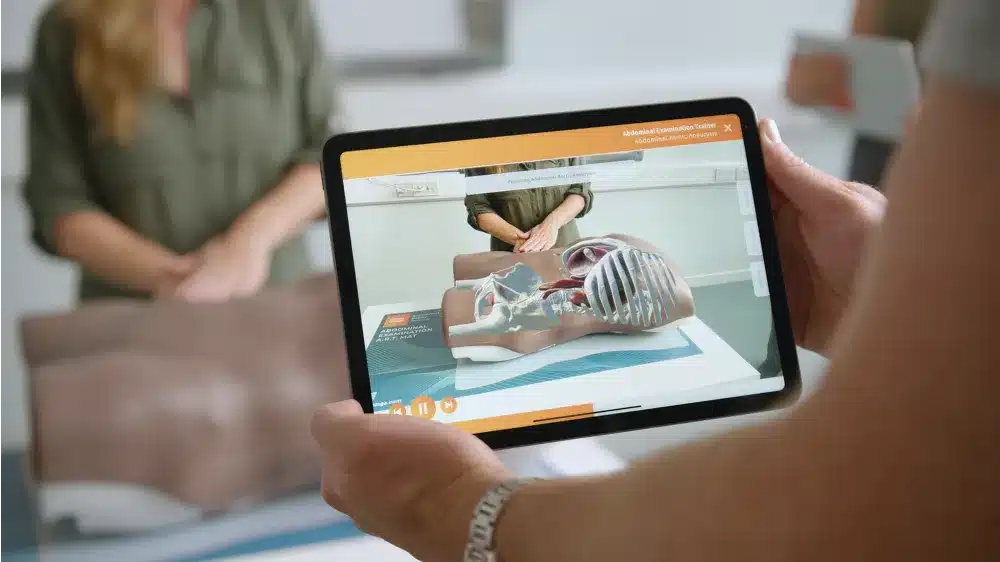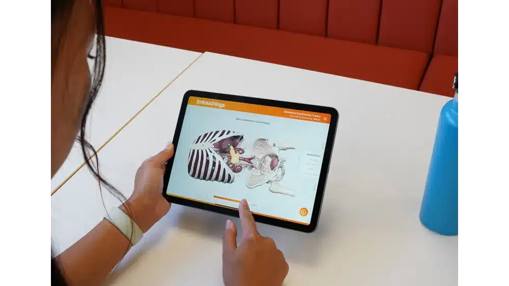 - Możliwość wykorzystania rzeczywistości rozszerzonej (AR) z matą Limbs AR Mat. W środowisku cyfrowym aplikacji, użytkownik porusza się wokół trenażera badania jamy brzusznej i ogląda nakładki anatomiczne, obejmujące: układ mięśniowy, narządy wewnętrzne, naczynia krwionośne oraz układ kostny. Interfejs aplikacji pozwala na płynne przełączanie się między warstwami anatomicznymi oraz wyświetlanie ich przekrojów.