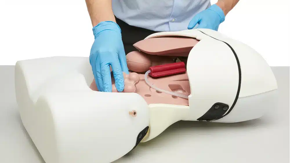 - Skóra brzucha jest realistycznie elastyczna, umożliwia symulację rozdęcia gazowego i wodobrzusza