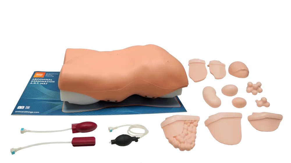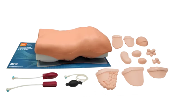 Trenażer pozwalający na ćwiczenie kluczowych technik palpacji, osłuchiwania i opukiwania stosowanych podczas badania jamy brzusznej i przewodu pokarmowego.