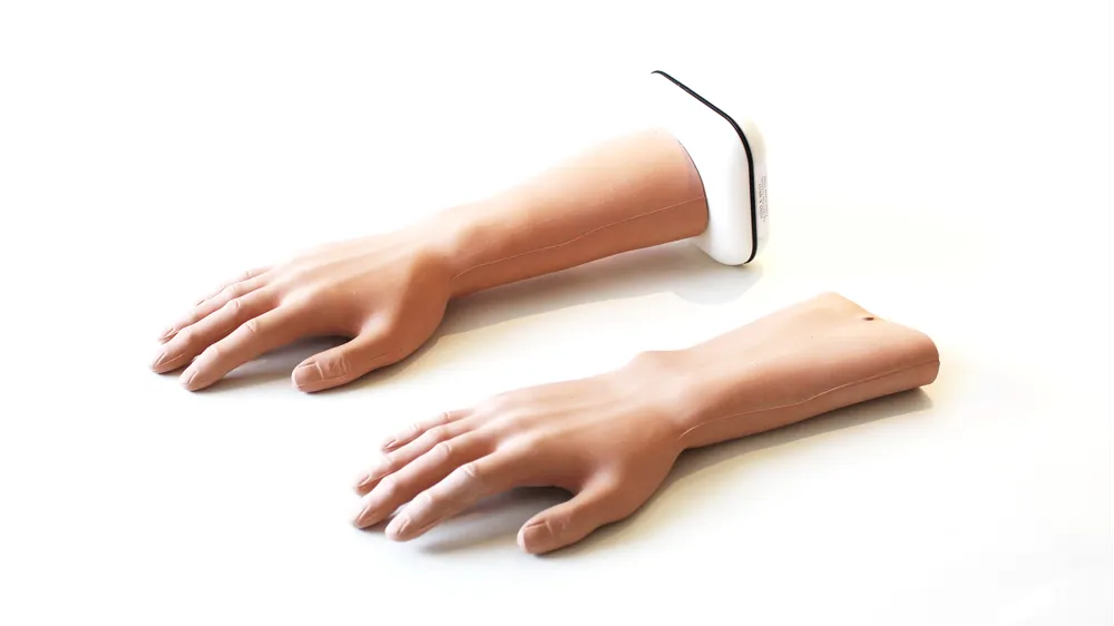 • Interaktywny model dłoni i przedramienia dorosłego mężczyzny z aplikację, która pozwala ćwiczącym otrzymywać natychmiastową pozytywną lub negatywną informację zwrotną, w zależności od tego, czy trafiono we właściwe miejsce wstrzyknięcia.
