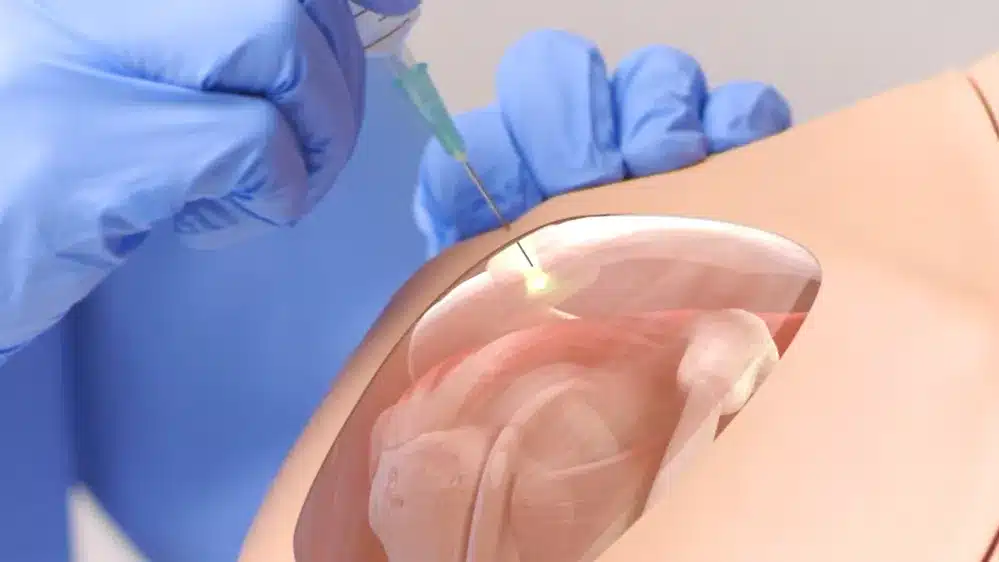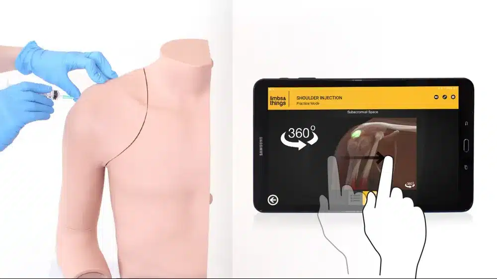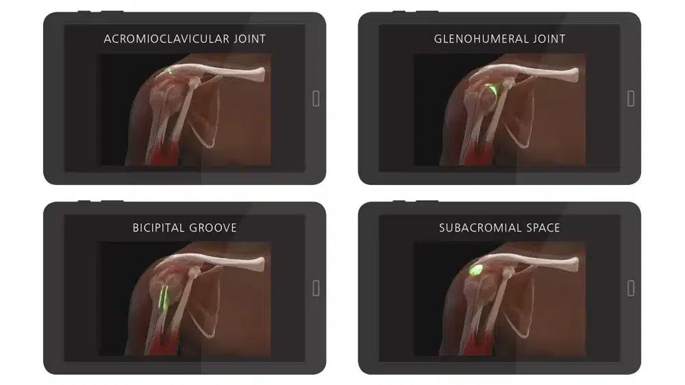 - Zawiera listę miejsc iniekcji oraz 360-stopniowy widok anatomii barku, oraz podświetla miejsce iniekcji po wykonaniu wkłucia