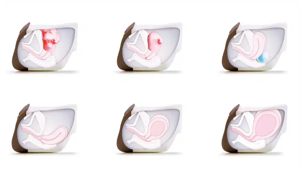 Zawiera torbiel jajnika w modelu pochwy kobiety, która rodziła więcej niż raz.